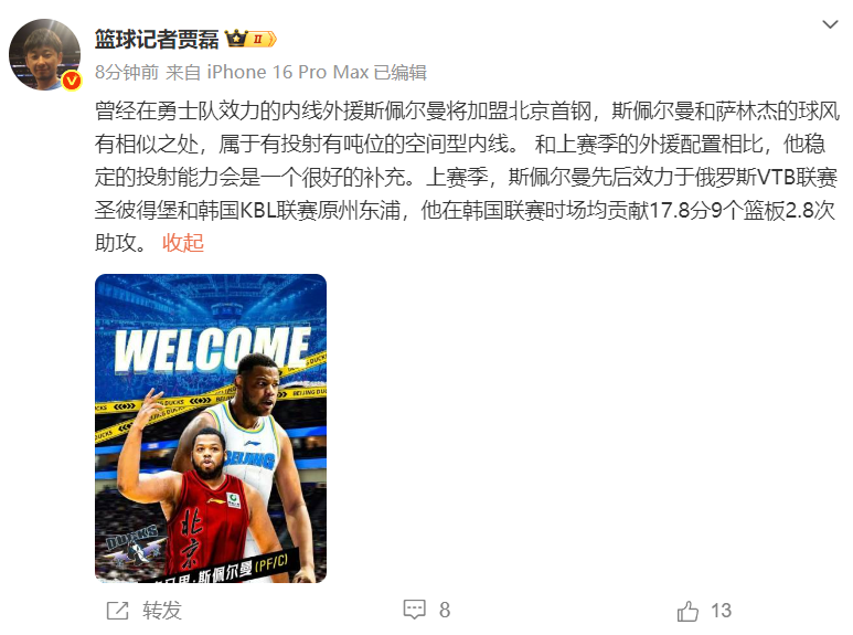 三天之前北京记者勇方方就透露过,斯佩尔曼接近签约北京,而且他还详细的分析了北京想要签下他的理由: